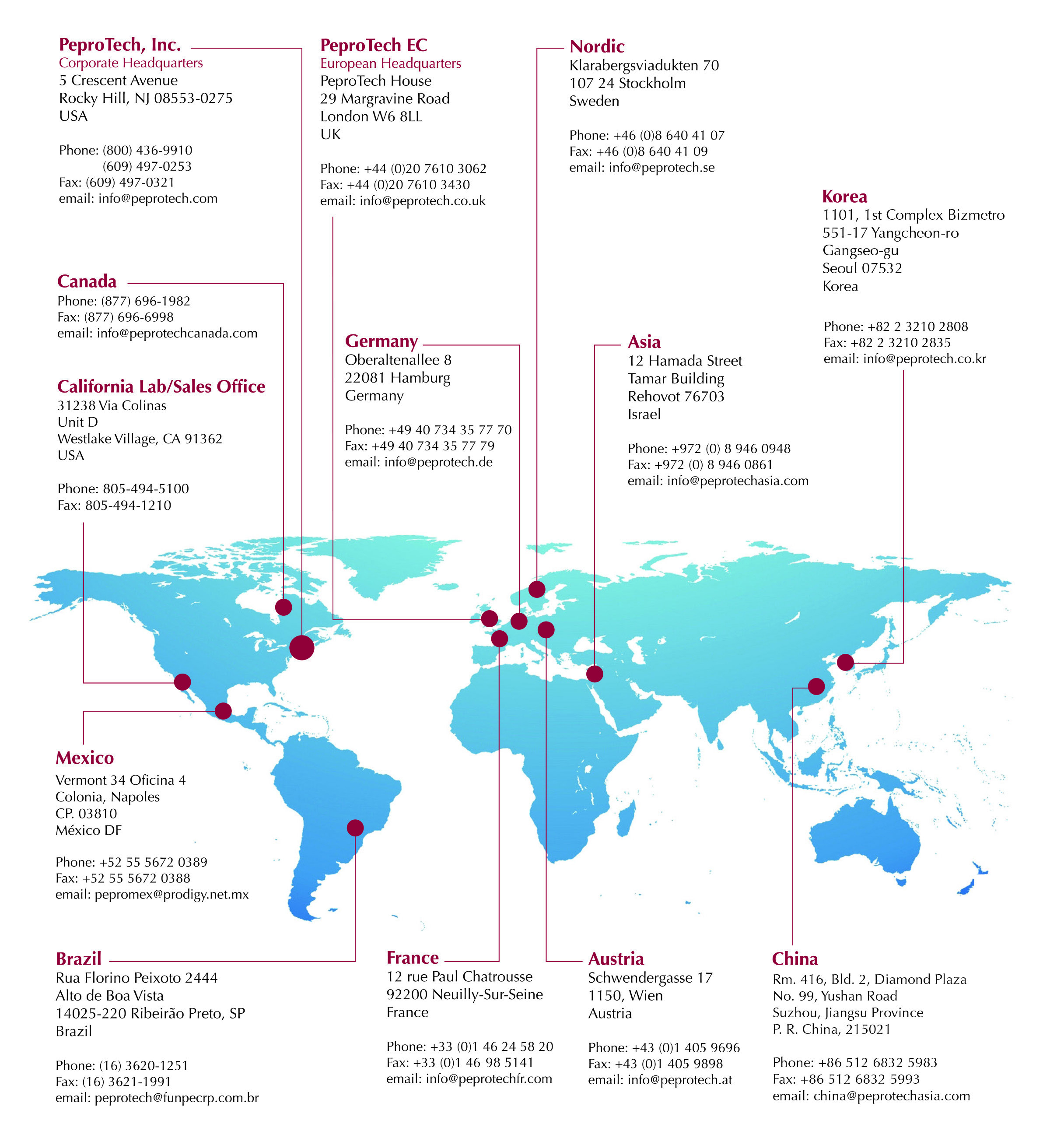 PeproTech 公司創(chuàng)立于1988年,總部位于美國(guó)新澤西州。 PeproTech 公司始 終致力于為生命科學(xué)研究和細(xì)胞治療市場(chǎng)提供高品質(zhì)的細(xì)胞因子產(chǎn)品。在過(guò) 去的27年 里,PeproTech在推動(dòng)這些領(lǐng)域的發(fā)展中一直扮演著重要角色。美 國(guó)總部的先進(jìn)生產(chǎn)設(shè)施和遍布十余個(gè)國(guó)家的客戶服務(wù)網(wǎng)絡(luò),使得PeproTech 公司成為科研工作者可以信賴的合作伙伴。同時(shí),來(lái)自科研院所和工業(yè)界的 研究人員為我們產(chǎn)品線的不斷擴(kuò)充提供了寶貴的意見(jiàn)和創(chuàng)意源泉。PeproTech 公司運(yùn)用創(chuàng)新方法開(kāi)發(fā)出 2000 余種高品質(zhì)、高穩(wěn)定性和重復(fù)性的 產(chǎn)品,包括大腸桿菌、昆蟲(chóng)細(xì)胞和哺乳動(dòng)物細(xì)胞來(lái)源的重組細(xì)胞因子/蛋白 、相關(guān)單克隆/多克隆抗體、ELISA試劑盒、無(wú)血清細(xì)胞培養(yǎng)基以及其他細(xì)胞 因子相關(guān)試劑。欲了解 PeproTech 全套產(chǎn)品線、獲取產(chǎn)品詳情和參考文獻(xiàn)等,請(qǐng)?jiān)L問(wèn)其官網(wǎng):www.peprotech.com。