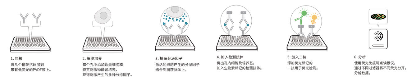相比于ELISpot,FluoroSpot依舊維持了ELISpot的高靈敏度,還能對單細胞分泌的多種細胞因子同時進行檢測,從而實現細胞亞群的鑒定和細胞多功能性分析。