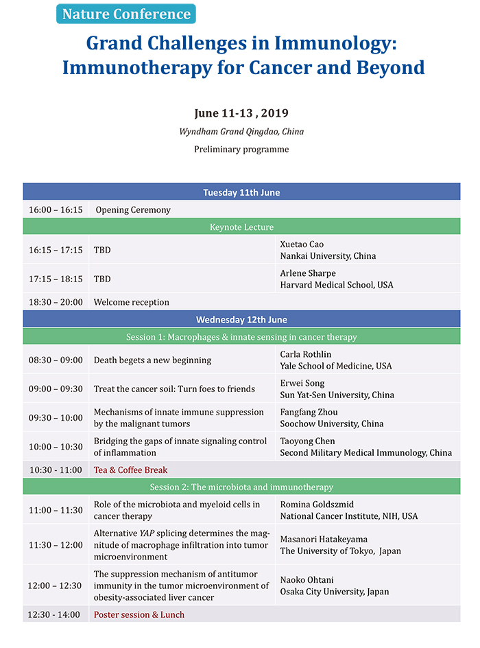 此會(huì)議是以《Nature Immunology》、《Nature Review Immunology》、《Nature》和《Cellular &Molecular Immunology》四本國(guó)際頂級(jí)免疫學(xué)期刊為交流平臺(tái),以促進(jìn)國(guó)際免疫學(xué)家交流為主旨的學(xué)術(shù)會(huì)議,自2009年起本系列會(huì)議啟動(dòng)召開(kāi),現(xiàn)已成功舉辦六屆會(huì)議。