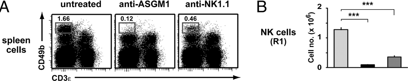 GM1是神經(jīng)節(jié)苷脂,是一種帶有單唾液酸的鞘糖脂。Asialo-GM1是不帶單唾液酸的GM1的衍生物。它表達在NK細胞、噬堿性粒細胞、單核/巨噬細胞和T細胞上,特別是早期胸腺細胞上。該抗體在多種小鼠品系中都可消耗NK細胞,包括C57BL/6, BALB/c, C3H和A/J小鼠,不顯示出小鼠品系特異性。而NK1.1僅表達在少數(shù)品系的小鼠上。