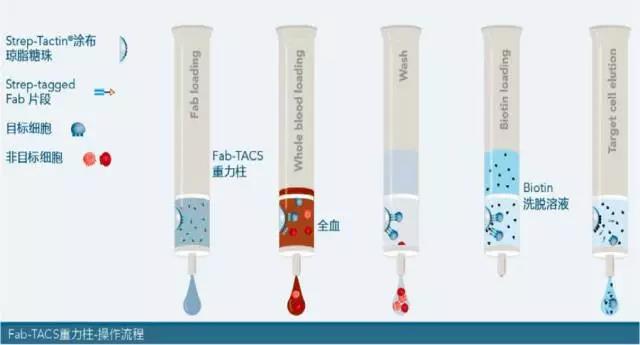 Fab-TACS重力柱內裝有經Strep-Tactin?涂布的細胞級中型瓊脂糖珠(cell-grade agarose matrix),如此一來,含有Twin-Strep-tag?的Fab片段(Fab-Streps)能與瓊脂糖珠結合。將全血或血液樣本加入重力柱,此時目標細胞會與Fab-Streps進行特異性結合,非目標細胞則會直接流出。隨后,清洗重力柱將多余的非目標細胞或血液雜質洗去。最后,加入生物素(biotin)中斷Fab-Streps與Strep-Tactin?間的結合,與此同時,低親和力的Fab-Streps也會從目標細胞上解離,而您便能獲得不含標記、幾近原始的目標細胞來進行后續的實驗。