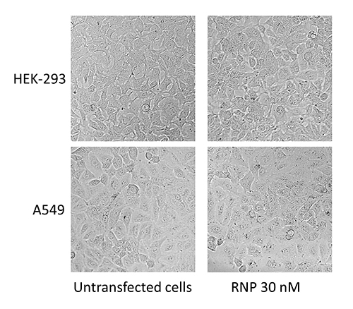 在96孔板中用30nm RNP(Cas9蛋白和HPRT1 sgRNA)和0.3 μl的jetCRISPR?轉染HEK-293和A549細胞,轉染48h后,使用phase contrast ZOE Fluorescent Cell Imager (BIORAD?)觀察細胞狀態。