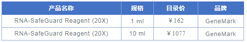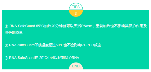 將RNA-SafeGuard Reagent (20X)用滅菌水稀釋成1X濃度,65°C反應20分鐘滅活水中、瓶中的RNase。剩余的1X RNA保存液