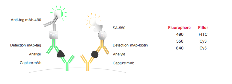 FluoroSpot能夠分析抗原特異性的多功能T細(xì)胞,例如,IFN-γ和IL-2的分析。三明治夾心結(jié)構(gòu)在熒光斑點(diǎn)中得以應(yīng)用,不同特異性的單克隆捕獲抗體混合物被包被于96孔板的PVDF膜上,生物素標(biāo)記的檢測(cè)抗體識(shí)別一種分泌物,tag標(biāo)記的檢測(cè)抗體識(shí)別其它的分泌物來(lái)實(shí)現(xiàn)雙色或三色細(xì)胞因子分泌細(xì)胞的檢測(cè)。檢測(cè)通過帶有特定熒光基團(tuán)的共軛試劑放大信號(hào)斑點(diǎn),可用自動(dòng)讀板器進(jìn)行分析。