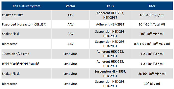 表1.Polyplus-transfection?提供一系列不同級別PEIpro?,滿足從工藝開發、臨床前、到臨床級別病毒載體的生產需求