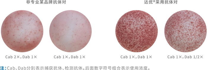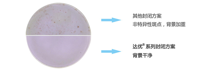 不同的檢測(cè)樣本在板孔培養(yǎng)過程中,受各種實(shí)驗(yàn)條件影響,如果封閉不當(dāng)都可能產(chǎn)生非特異性顯色,導(dǎo)致非特異性斑點(diǎn)的產(chǎn)生或者背景顏色的加重。這將直接影響到最后結(jié)果的判斷分析。達(dá)優(yōu)?系列產(chǎn)品通過大量實(shí)驗(yàn),對(duì)不同來源、不同配方封閉方法進(jìn)行封閉效果的對(duì)比試驗(yàn),篩選出更高效的封閉系統(tǒng),并將之運(yùn)用到系列試劑盒產(chǎn)品中。