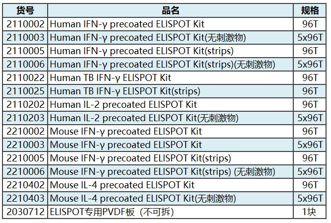 達(dá)優(yōu)ELISPOT產(chǎn)品列表