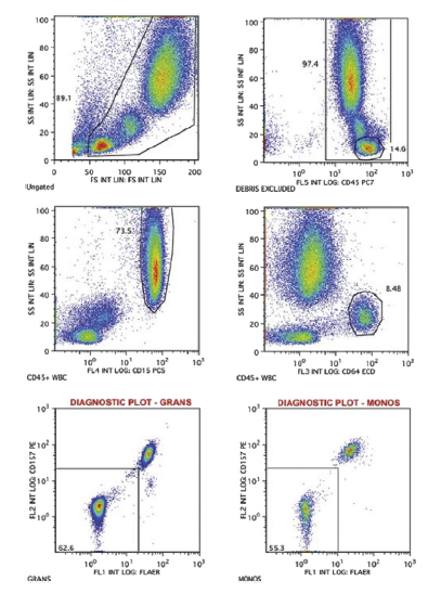 圖:取新鮮PNH病人外周血裂紅后用FLAER染色,分析單核細(xì)胞、粒細(xì)胞中的PNH克隆數(shù) [1]