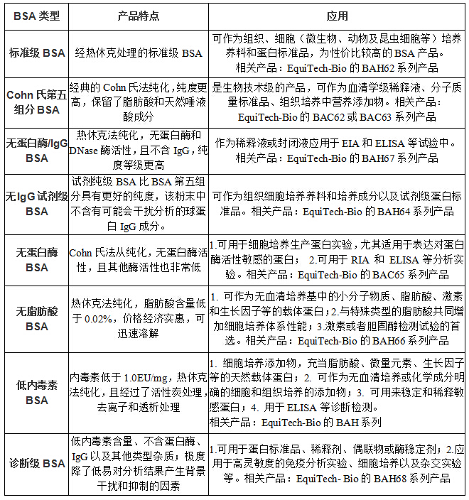 牛血清白蛋白Albumin from bovine serum,BSA,又稱為組分V或Cohn V,名稱起源于BSA的分餾法——Cohn 冷乙醇法, Cohn 冷乙醇法是由哈佛大學(xué)Edwin Cohn教授于1946年發(fā)明的。當(dāng)時(shí)基于戰(zhàn)爭創(chuàng)傷治療對注射級(jí)別蛋白的大規(guī)模需求,Cohn教授在較低的溫度下改變血漿的乙醇濃度和pH值,使其所含蛋白在不同乙醇濃度下析出,在第五個(gè)析出的組分中主要成分為BSA,所以BSA又稱組分V或Cohn V。Cohn法仍然是目前非常普遍的BSA分餾法。 美國大的生物原材料供應(yīng)商Equitech-Bio提供經(jīng)典冷乙醇法和先進(jìn)的熱休克法純化的高質(zhì)量、分類齊全的BSA,助力您的實(shí)驗(yàn)!