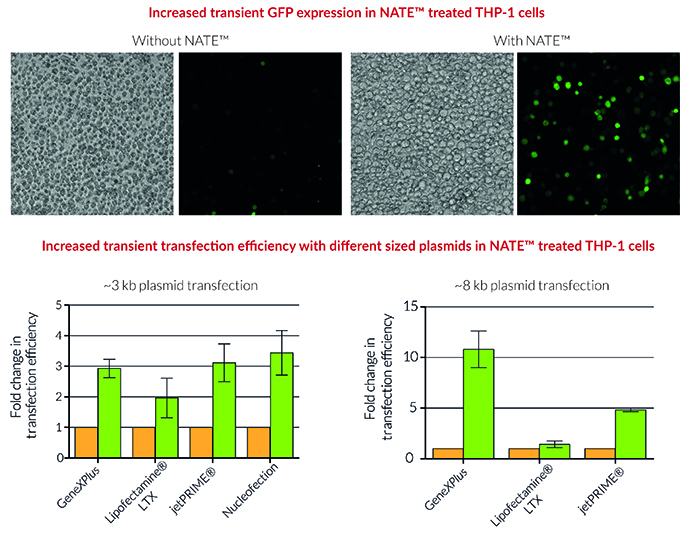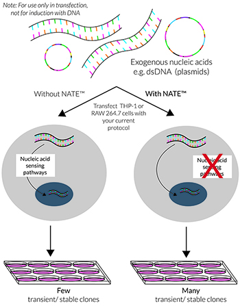 NATE?是由InvivoGen專門推出的核酸轉染增強劑,用于提高免疫細胞的瞬時和穩定轉染效率,尤其適合THP-1和RAW 264.7細胞,只需在轉染步驟前添加NATE?孵育30分鐘,即可進行后續轉染操作。
