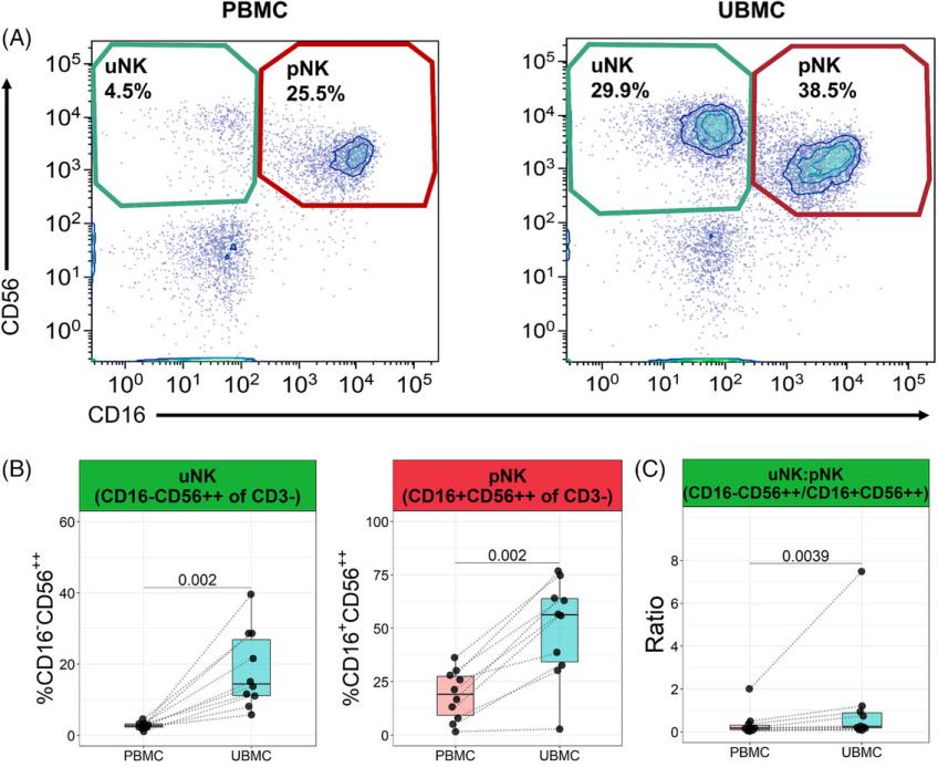 Kahn等人采用了一種從胎盤床收集白細(xì)胞的技術(shù),即在剖腹產(chǎn)后使用手術(shù)海綿擦拭子宮腔。這種方法通常用于確保胎盤從子宮腔中完全移除并清除多余血液,因此不會(huì)給患者帶來(lái)額外的風(fēng)險(xiǎn)。本文采用這種方法分析胎盤床NK細(xì)胞、T細(xì)胞、B細(xì)胞和單核細(xì)胞的表型,并與外周血樣本中對(duì)應(yīng)細(xì)胞進(jìn)行比較。