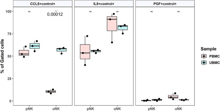 與外周血白細(xì)胞相比,胎盤床樣品中的CD16-CD56++NK細(xì)胞明顯表達(dá)更高的CCL5 mRNA(圖4)。另一方面,胎盤床和外周血中CD16+CD56++細(xì)胞表達(dá)的RANTES mRNA水平相似。此外,在胎盤床和外周血樣本中,兩種NK細(xì)胞中IL8和PGF mRNA水平均無(wú)差異。