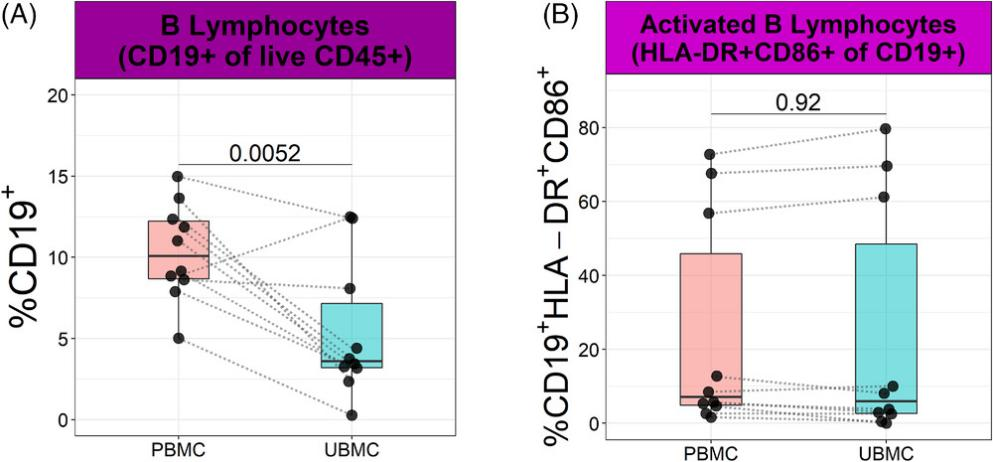 外周血B細(xì)胞(CD45+CD3-CD19+)占總活的CD45+白細(xì)胞比例高于胎盤床樣品(分別為10.34 ± 0.94%和5.36 ± 1.33%)(圖6A)。為了研究B細(xì)胞的活化狀態(tài),本文還檢測(cè)了CD86和人類白細(xì)胞抗原(HLA)II類分子HLA-DR的表達(dá)。外周血和胎盤床樣品中表達(dá)這兩種受體的B細(xì)胞比例相似(圖6B)。
