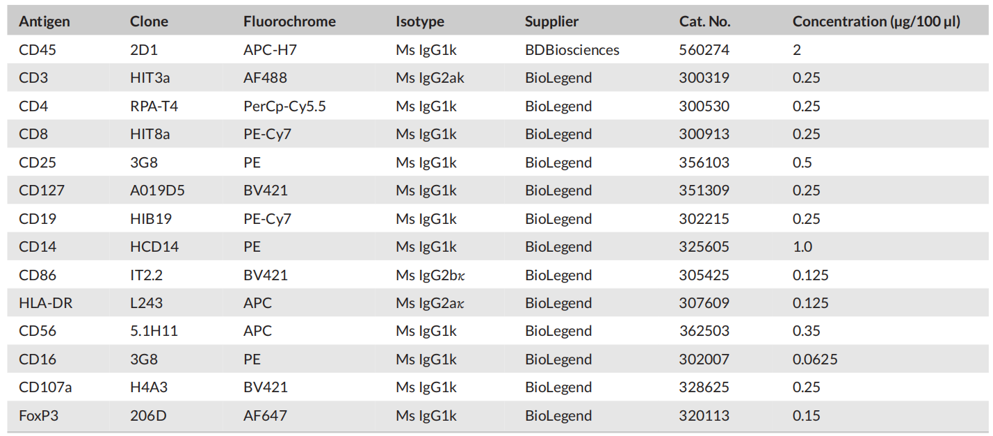 T regulatory細(xì)胞:CD45+CD3+CD4+CD8-CD25+FoxP3+CD127low