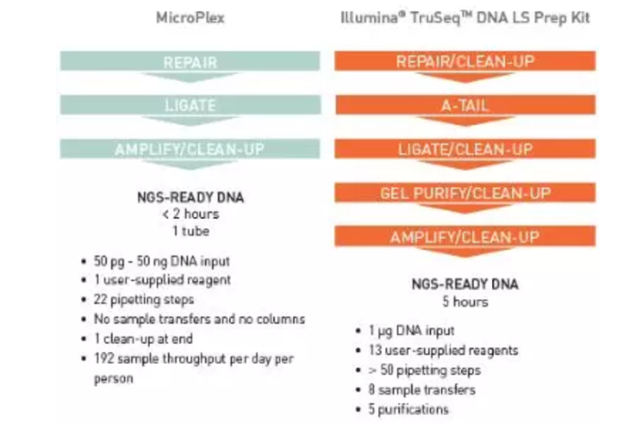 MicroPlex ki只需要一次純化,三步即可完成。而Illumina?的工作流程需要純化多次,經(jīng)過5步才能完成。