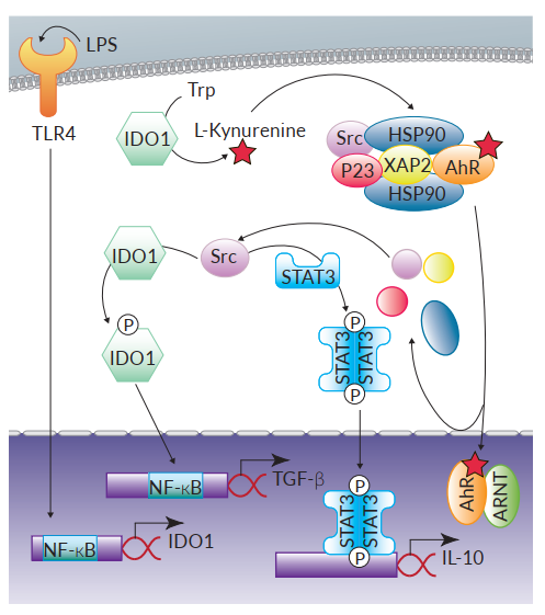 AhR參與調節促炎反應和耐受反應的機制可以從多方面解釋,除了前文提過可以導致IL-22產生的典型AhR信號,AhR也通過非基因組途徑導致至少兩個抑制性效果。研究發現與AhR相關的Src激酶能夠磷酸化吲哚胺2,3-雙加氧酶(IDO1),進而激活NF-κB轉錄因子誘導DCs中抑制性細胞因子TGF-β(transforminggrowth factor)的轉錄,達到抑制小鼠對LPS的過度應答9。此外, IDO1對Trp的降解提供了例如L-型犬尿氨酸(L-Kynurenine)的AhR激動劑,提示了這通路與Treg的產生有關9。在巨噬細胞中,AhR另一個抑制作用是在LPS誘導下,AhR協同Src激酶和STAT3信號通路產生抗炎細胞因子IL-10。值得留意的是,TLR4對LPS的識別可促進巨噬細胞中AhR的表達,但目前尚不清楚在其他模式識別受體配體刺激的情況下是否也是如此10。