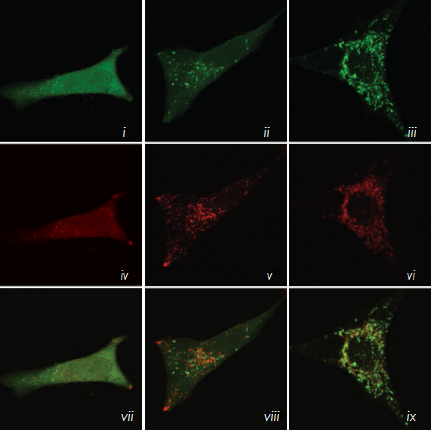 ☆HeLa-Difluo?hLC3細胞被25μM rapamycin 單獨處理或25μM rapamycin和 500nM bafilomycin A1(抑制自噬體和溶酶體融合)聯合處理。孵育24小時,用2% PFA固定細胞,并用共聚焦顯微鏡分析結果。請注意在圖片viii中,黃色(自噬體)和紅色(自噬溶酶體)斑點均顯著提升,而圖片ix中的斑點幾乎均為黃色(自噬體)。